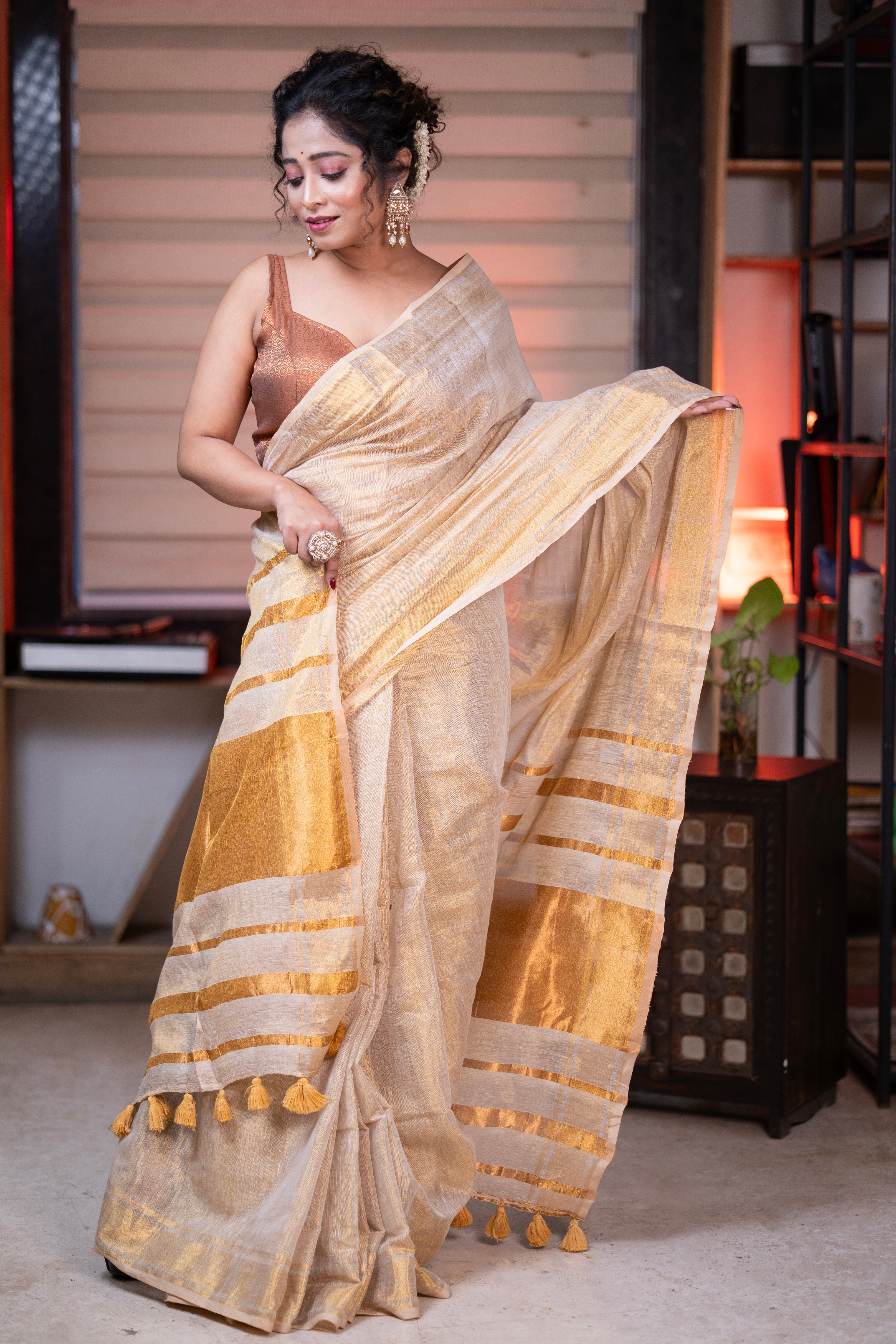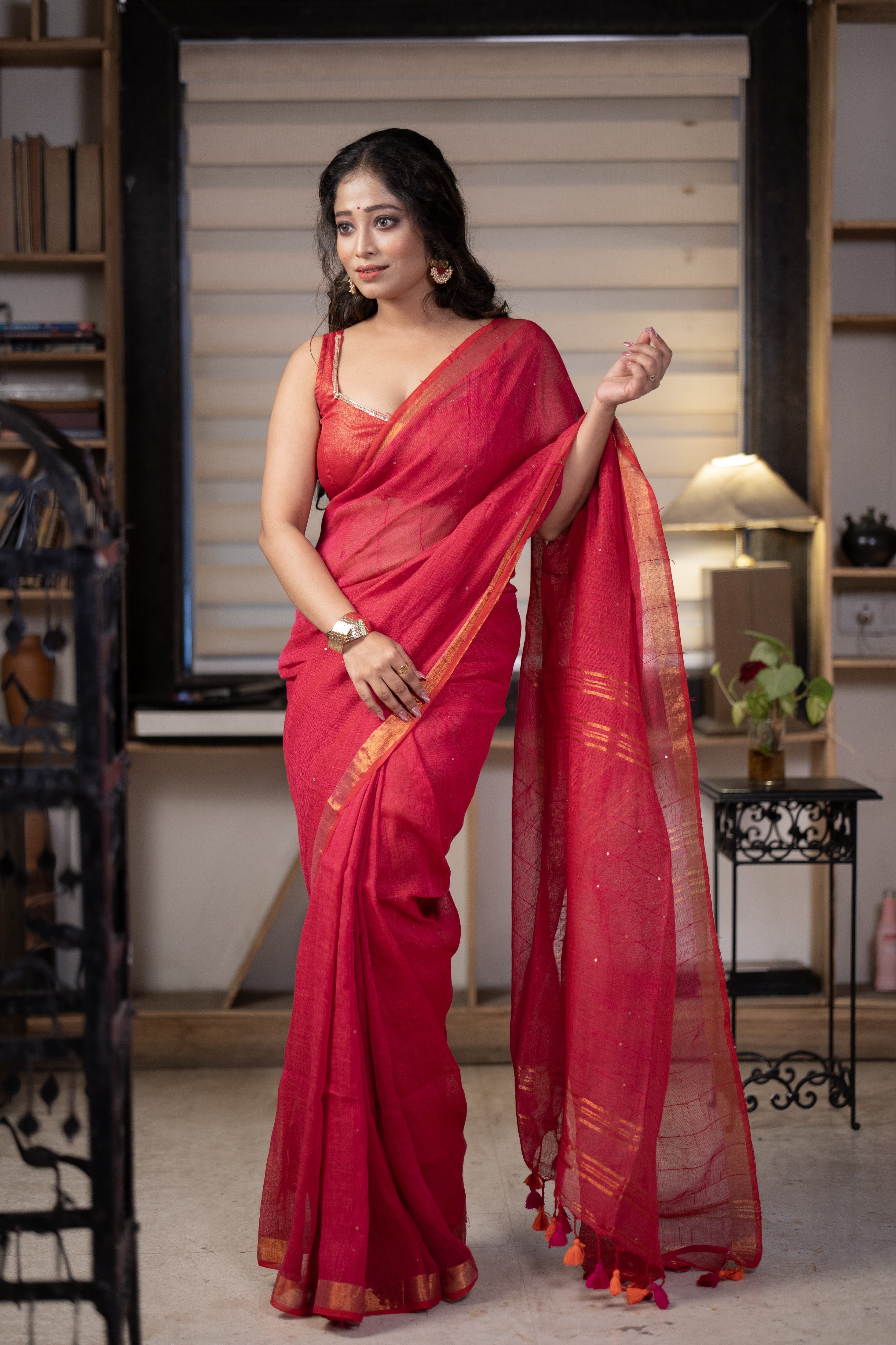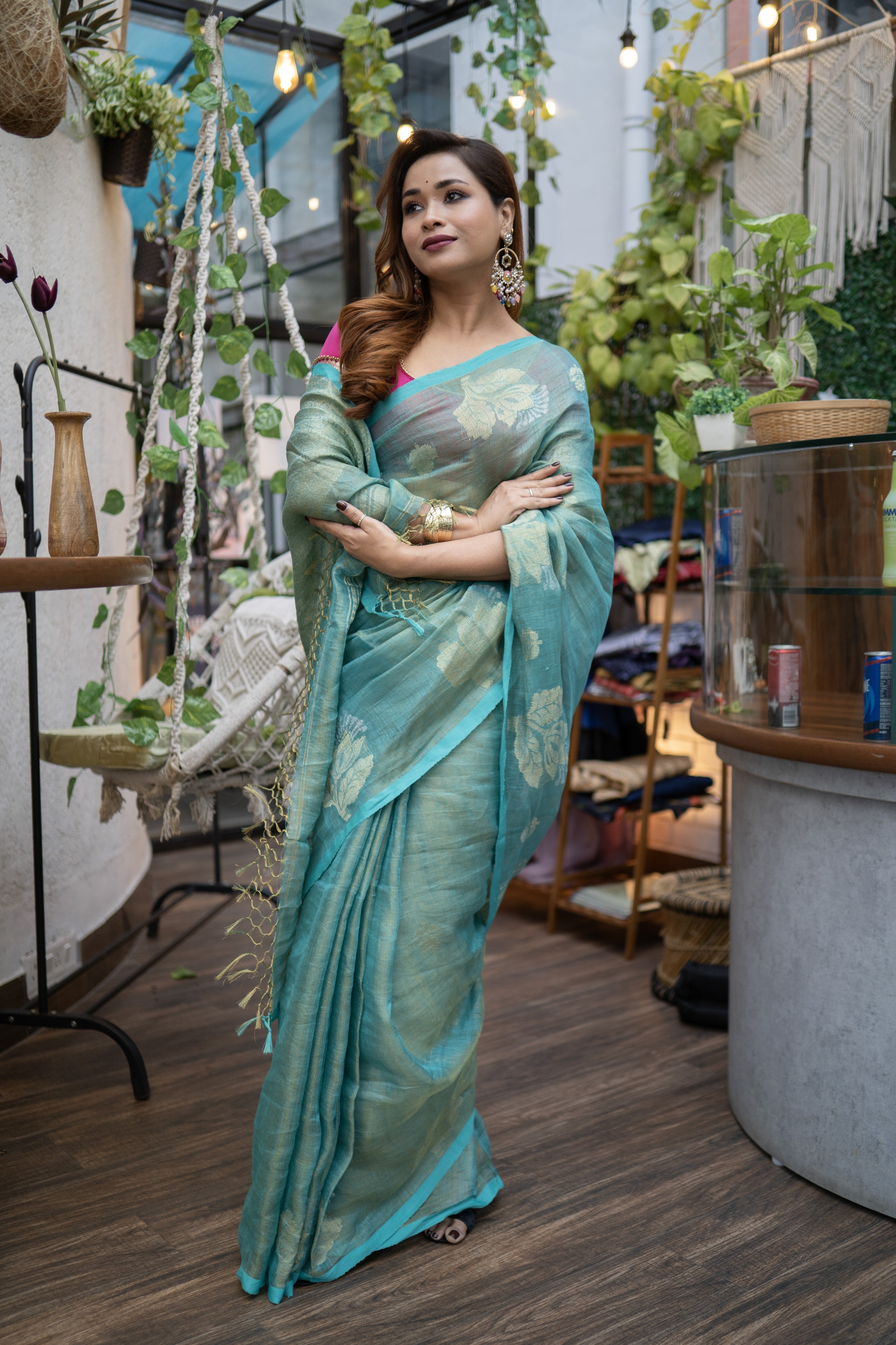 "Itni stylish aur classy saree maine pehli baar li hai. Quality top-notch hai aur iska overall look mujhe bohot pasand aaya. Perfect combination of traditional aur modern style hai. Har koi mujhe ispe compliments deta hai. Mujhe apne collection ke liye yeh best lagti hai!