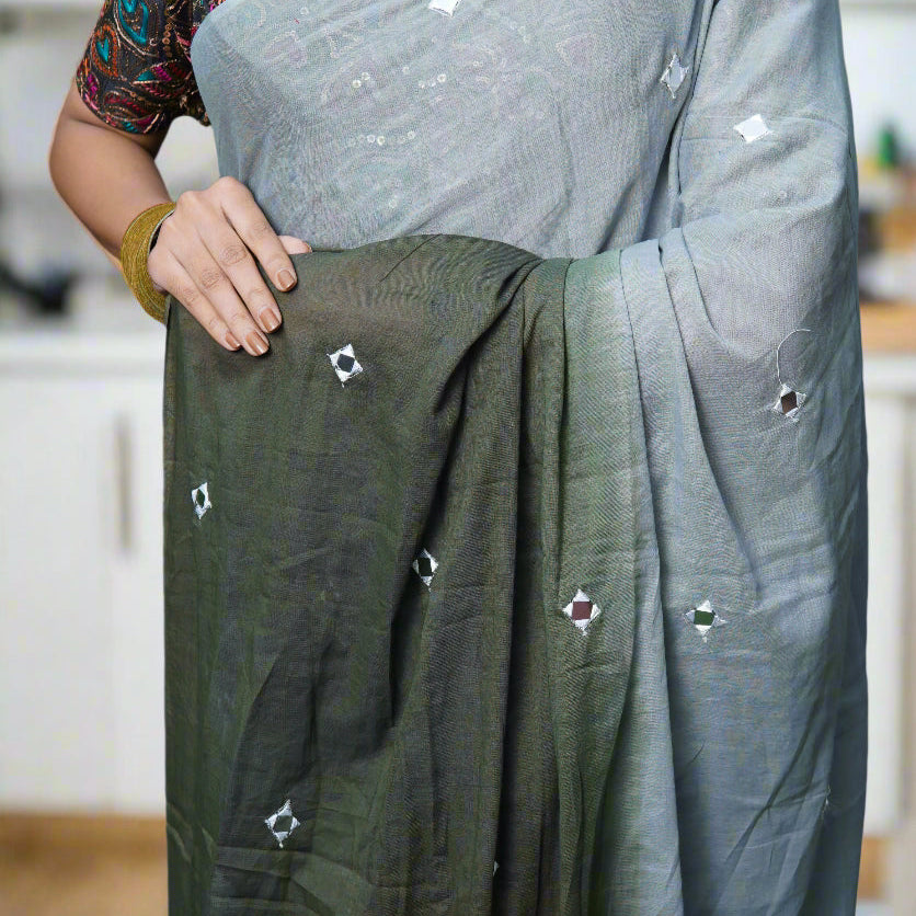 Dark green Sequence Work Linen Saree with golden zari border